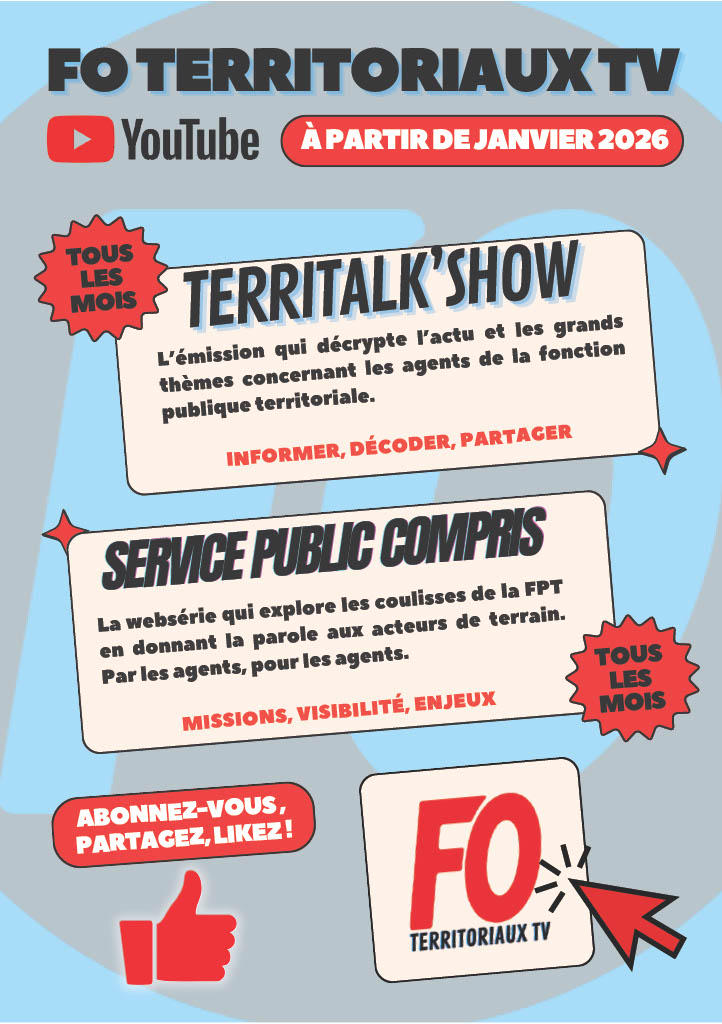 Une chaîne Youtube vient d’être lancée « FO Territoriaux TV », tous les mois « Territalk’Show » l’émission qui décrypte l’actualité et les grands thèmes concernant les agents de la fonction publique territoriale et la websérie « Service public compris » qui explore les coulisses de la FTP en donnant la parole aux acteurs de terrain. Par les agents, pour les agents. Abonnez-vous, partagez, likez!